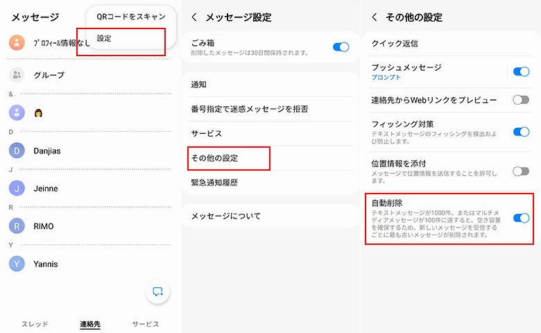 Googleメッセージアプリの想定外のバグがAndroidでテキストメッセージが勝手に削除される問題を引き起こしているケースもあります。さらに、メッセージの設定で「古いメッセージを削除」をオンにしている場合には、古いテキストメッセージが消えてしまいます。