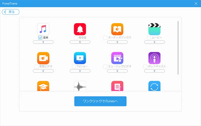 - メニューバーから同期したいデータを選択し、「ワンクリックでiTunesへ」をクリックします。