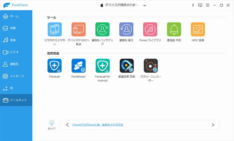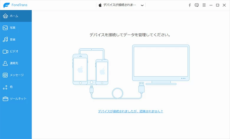 - iPhone Data Transferをパソコンにインストール後、ソフトを起動します。パソコンとiPhoneをUSBケーブルで接続します。ソフトがiPhoneを正常に認識すると、次のような図が表示されます。