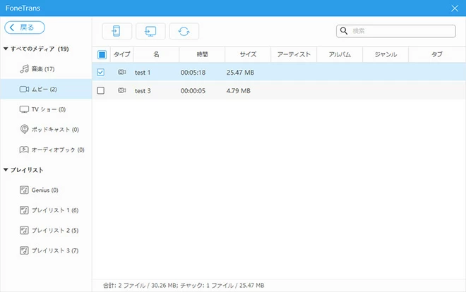 - 左のメニューバーで該当するタブを選択し、右のリストで転送するファイルを選択し、上の携帯アイコン「