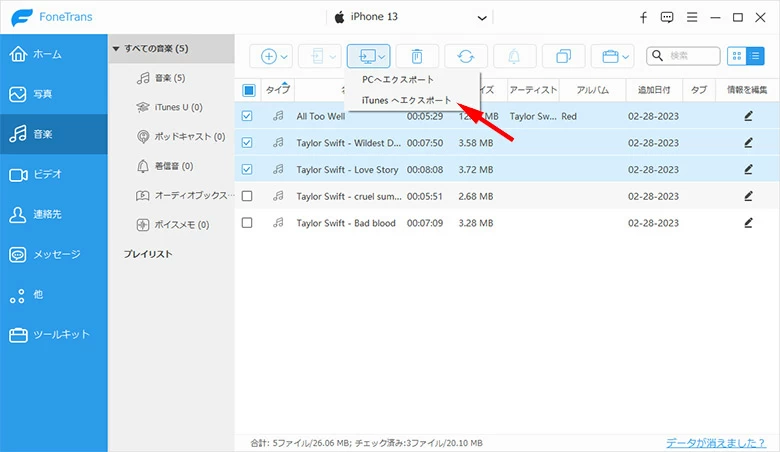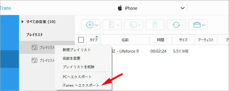 」をクリックして「iTunesへエクスポート」を選択します。