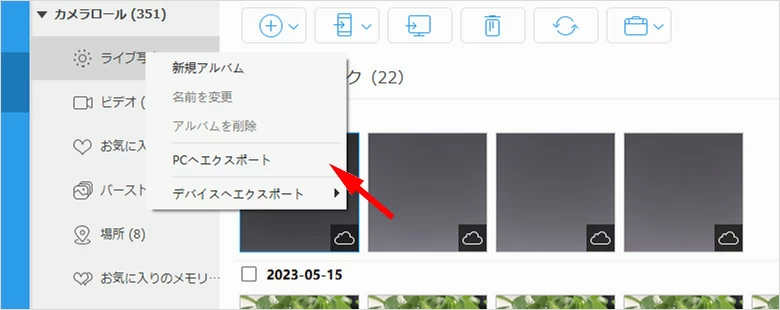 - または、左側のリストから特定の写真種類を右クリックし、「PCへエクスポート」で選択した写真を一括にパソコンに転送できます。