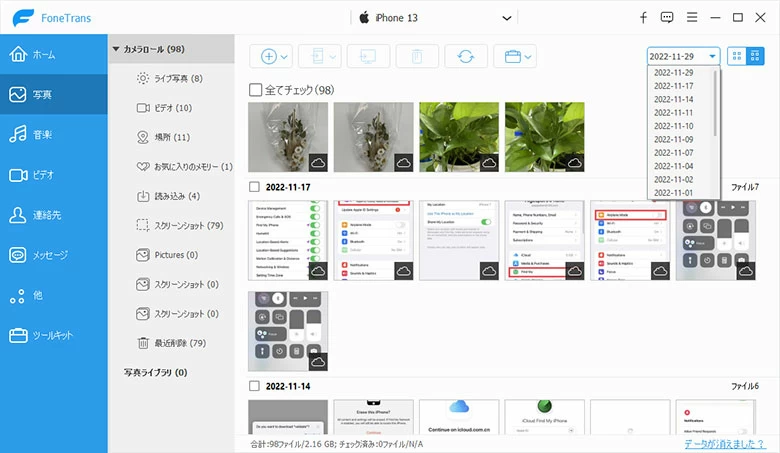 - 「写真」タブをクリックすると、以下のようにiPhone上の写真データがすぐに表示されます。