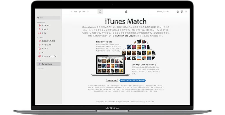 「iTunes Match」とはiTunes Storeで購入した曲やCDからパソコンの中に取り込んだ曲を年間3980円でiCloudに保存できて、いつでもネットからダウンロードできるサービスです。