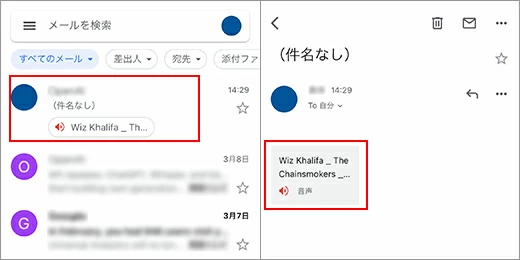 iPhoneでメールを開き、パソコンから送信されたメールを開きます。曲ファイルが添付されていることを確認し、添付ファイルをタップして開きます。