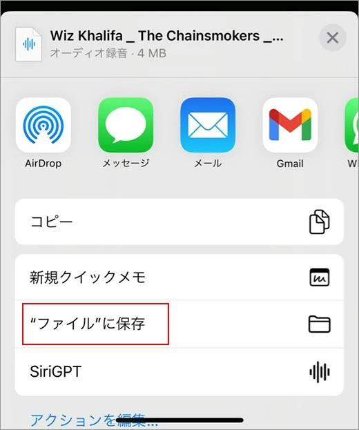 「ファイルを保存」を選択すると、曲ファイルがiPhoneにダウンロードされます。ダウンロードが完了すると、iPhoneの音楽アプリを開いて、曲を再生してみてください。