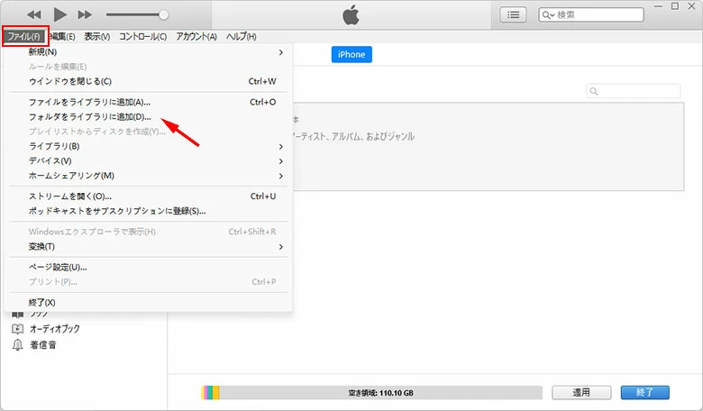 iTunesで「ファイル」をクリックし、必要に応じて「ファイルをライブラリに追加」または「フォルダをライブラリに追加」をクリックし、開いたウィンドウから、iPhoneに同期したい音楽ファイルを選択します。