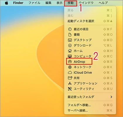 手順 1. Macのメニューバーで「移動」オプションをクリックし、「AirDrop」を開きます。