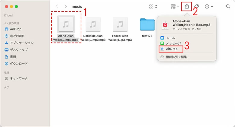 また、フォルダで送信してい音楽ファイルを選択し、共有ボタンをクリックし、AirDropでiPhoneにパソコンの曲を送信するもできます。