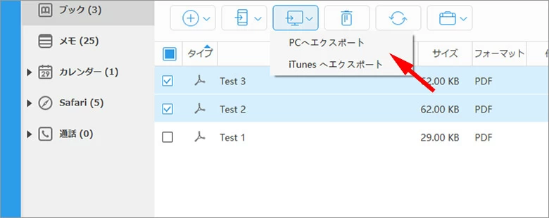 iPhoneのブックに保存されたPDFファイルは、iTransferを使って以下の手順でPCに転送します。