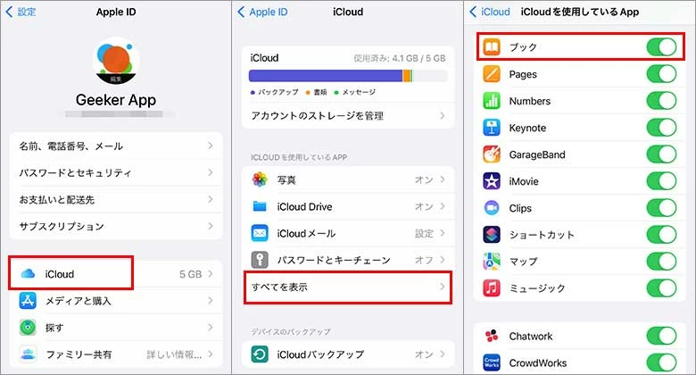 - 「iCloud」をタップして、クラウドにデータを保存する項目を「オン」にします。