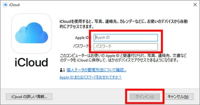 - Apple IDを使ってWindows用iCloudにサインインします。iPhoneで使用しているものと同じApple IDでサインインします。