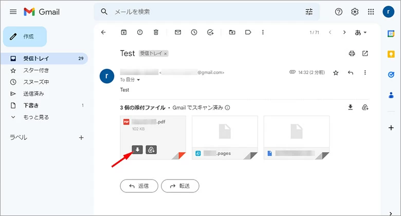 - コンピューターのメールボックスにログインし、メールや下書きを開き、PDFファイルをパソコンにダウンロードします。