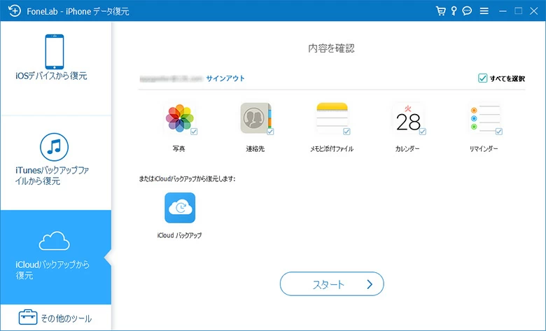 4. ログインしてから他の項目のチェックを外し、青色の「iCloudバックアップ」ボタンをクリック、続けて「スタート」を選択します。