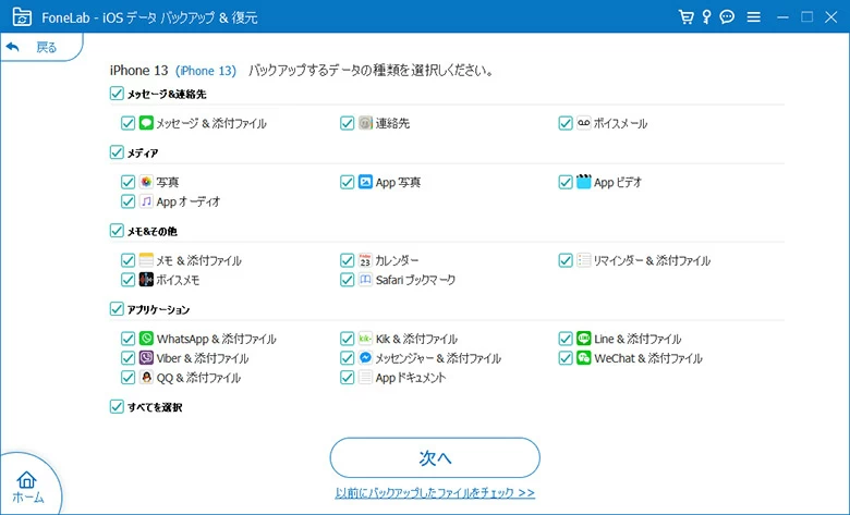 Appleが推奨する方法で、クラウドやパソコンにデバイスのバックアップを取ることができますが、こういった場合に役立つiPhone Data Recovery(当記事のパート3とパート4を参照)に統合された「iOSデータバックアップ&復元」機能をここでご紹介します。これを使えば、バックアップが必要なデータの種類を選択していつでも復元することができます。手順は以下の通りです。