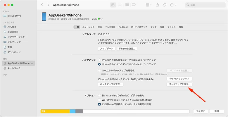 3.「概要」の下(もしくはFinderの「一般」タブ)で、「バックアップを復元」を選択します。
