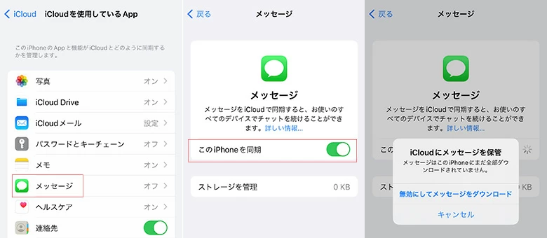 6. もう一度同じステップで、「このiPhoneを同期」をオフに切り替えます。「iCloudにメッセージを保管」通知が表示されたら、「無効にしてメッセージをダウンロード」を選択します。