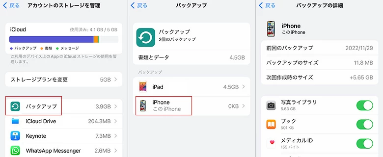 「設定」アプリを開いて、「[ユーザー名]」 > 「iCloud」 > 「アカウントのストレージを管理」に進みます。「バックアップ」をタップし、「このiPhone」を選択します。前回バックアップを取った日付とサイズを確認します。古いテキストメッセージを失った時よりも前にバックアップを取っている場合、復元することで元に戻せます。