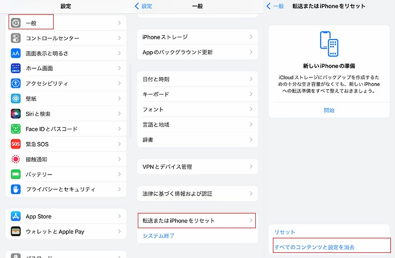 4.「すべてのコンテンツと設定を消去」を選択します。
