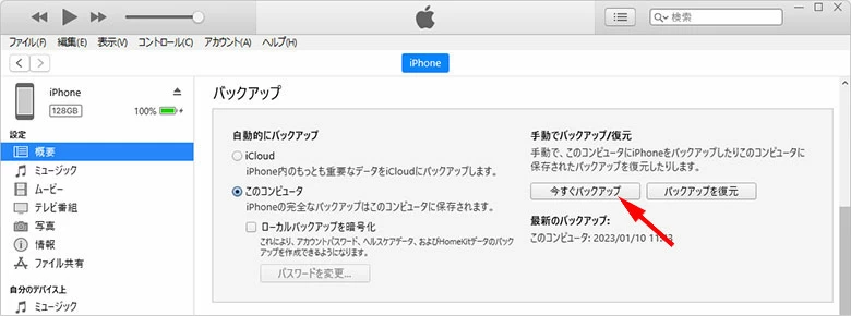iPhoneのゴーストタッチが発生した場合、まずはiTunesでの復元を試してみるとよいでしょう。使いにくそうに思われがちなiTunesですが、操作方法はとても簡単。そして、データをバックアップすることができます。iTunesを使うことで、現在にiPhoneに保存されているデータをバックアップしてから、初期化が可能です。以下に手順を示します。