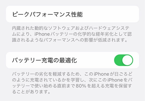 もしiPhoneのバッテリー残量が十分あると表示されていても充電中にシャットダウンしてしまうのであれば、バッテリーの状態が悪いのが原因かもしれません。iPhoneのバッテリーのパフォーマンス性能を確認するには、〔設定〕 > 〔バッテリー〕 > 〔バッテリーの状態〕 に飛んでください。