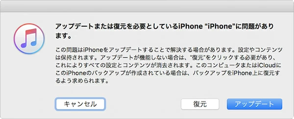 iPhoneが「support.apple.com/iphone/restore」の画面でフリーズした場合、パソコンでiTunesを起動し、デバイスと接続させた上でiOSを再インストールする必要があります。これにより結果的にiPhoneリカバリーモードから脱出でき、起動して動作するようになります。これはソフトウェアアップデートと同じプロセスであるため、最新バージョンのiOSを再インストールしてもデータは消えません。