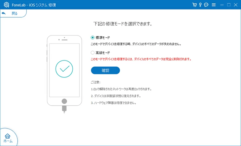 そして、修復モードを選択します。まずは、「標準モード」を選択してiPadがオンに切り替わるかを確認します。この作業によりデバイスのデータが削除されることはありません。確認ボタンをクリックします。