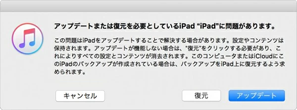 Step 5: iPadがリカバリーモードに切り替わると、FinderまたはiTunesで「復元」と「アップデート」の選択肢が表示されます。アップデートオプションを選択して、iPadにiPadOSを再インストールします。この作業には15分ほどかかり、その後、iPadのリカバリーモードが解除されてから、もう一度上記のステップを繰り返す必要があります。