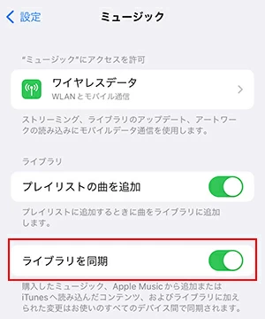 iCloudミュージックライブラリをオフにするよう指示された場合は、iPhoneの設定アプリを開き、ミュージックまでスクロールダウンして、「ライブラリを同期」のスライダーをOFFに切り替えてください。
