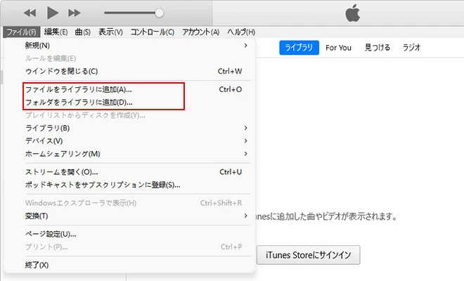 iTunesを起動し、メニューバーの「ファイル」タブをクリックします。「ファイルをライブラリに追加」と「フォルダをライブラリに追加」の両方のオプションで、PCからすべての楽曲を簡単にインポートすることができます。その後、左側のサイドバーから「ライブラリ」の「曲」をクリックすると、iTunesのミュージックライブラリに必要な音楽が含まれているかどうかを確認することができます。