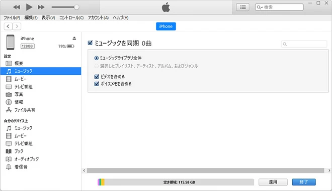 4. 準備がすべて整ったら、iTunesアプリウィンドウに戻り、ウィンドウの下部にある適用ボタンをクリックして、iTunesライブラリからiPhoneへの音楽の同期を開始させます。プロセスが終了するまで、iPhoneの接続を切らないでください。