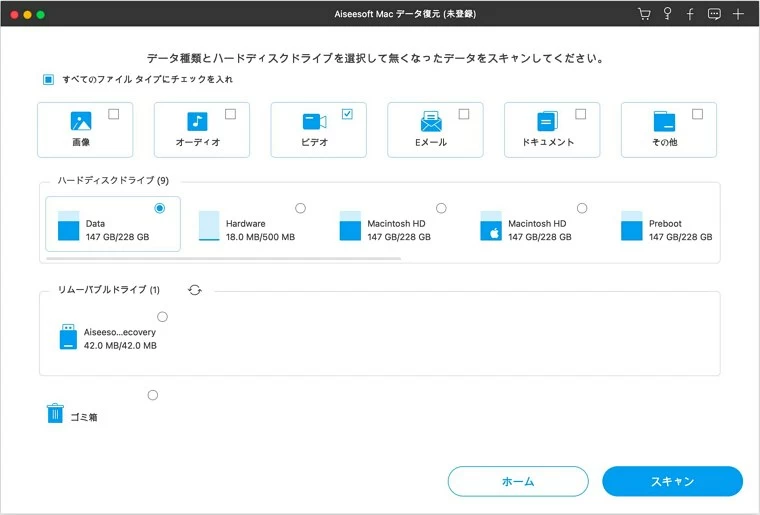 Macで失われたデータを復元するのはとても簡単です。ファイルの種類を「動画」に選択し、削除した動画が保存されているドライブもスキャンする必要があります。スキャンが完了したら、どの動画ファイルを取り戻したいかをソフトウェアに伝えて、それを選択します。