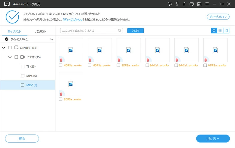 Step 2: 復元 - 復活したい動画を選択して、すぐに「復元」ボタンをクリックすると、ソフトは動画を復元させます。復元にかかる時間は動画ファイルの大きさによって異なります。