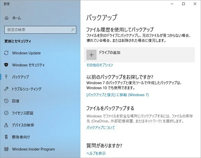 外付けドライブをコンピュータに接続します。[設定] > [更新とセキュリティ] > [バックアップ] に移動します。[ドライブの追加] をクリックし、接続されているディスク ドライブを選択します。「ファイル履歴を使用してバックアップする」セクションで、「ファイルを自動的にバックアップする」のスイッチをオンにします。「その他のオプション」をクリックしてバックアップを手動で実施することもできます。