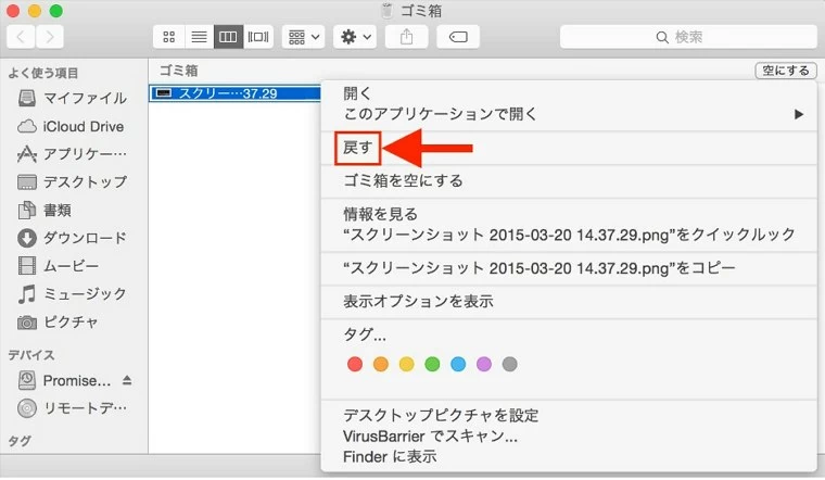 ゴミ箱にアクセスしたら、復元したい削除された動画を探し、右クリックしてメニューから「戻す」を選択します。
