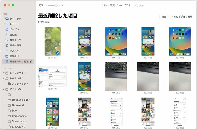 iPhoneやiPadと同様に、MacOSの写真アプリには最近削除されたフォルダがあり、誤って削除した写真だけでなく、動画も一時保存することができるため、動画の復元が可能です。動画を復元するには、次の手順を行ってください。