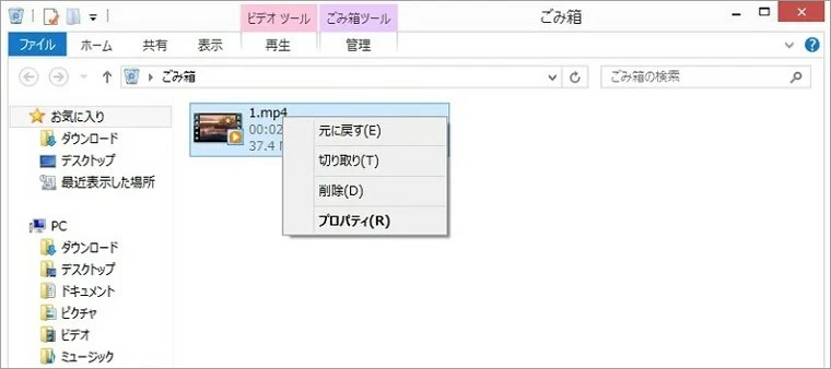 デスクトップ上のごみ箱のアイコンをダブルクリックしてごみ箱にアクセスし、復元したい動画を右クリックし、「復元」を選択します。