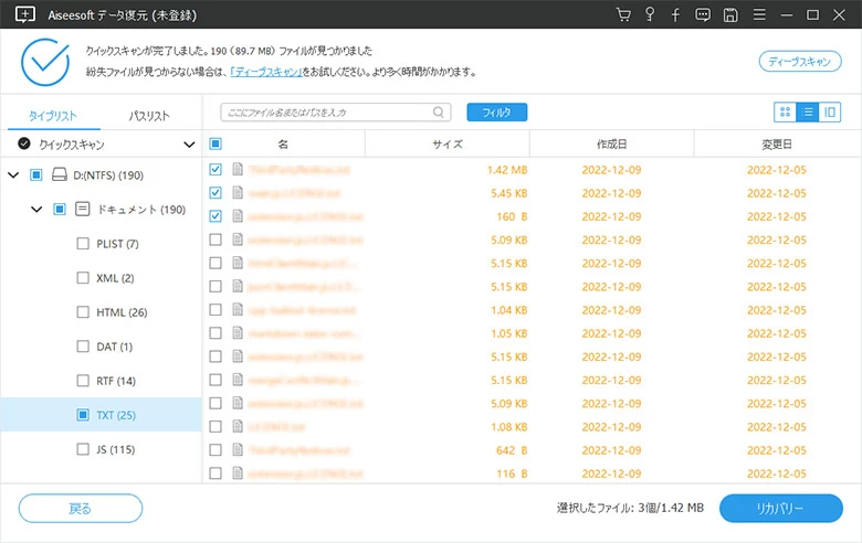 その高度なスキャナーがあらゆるメディアストレージデバイスからすべての削除されたテキストファイルを抽出し、復元可能な削除されたテキストファイルを順番にリストアップすることができます。優れたフィルタリングとソートオプションで、削除したメモ帳のテキストファイルをすぐに見つけて、簡単にWindowsで削除されたテキストファイルを復元することができます。