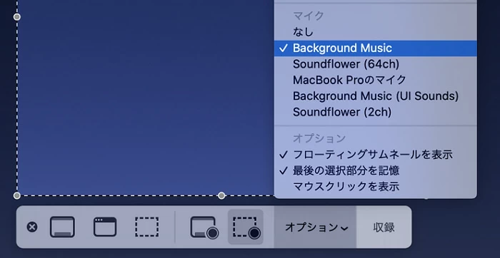 または、アプリケーション > QuickTime > ファイル > 新規画面録画でツールバーを開くことができます。