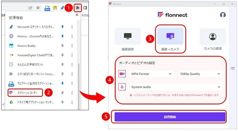 Flonnectは、スクリーン、カメラ、またはその両方をクリアな音質で録画できる、無料で強力なツールです。Chrome拡張機能として利用することができます。