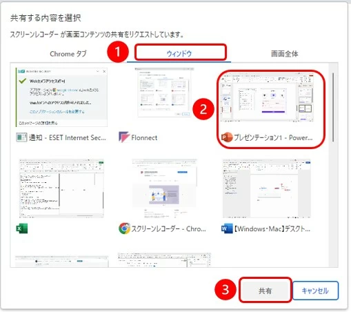 ③PowerPoint スライドショーのウィンドウを選択します。