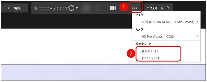 ②「録音をクリア」からあるページの部分だけ撮り直しするなら「現在のスライド」、全てやり直しするなら「すべてのスライド」を選択して撮り直しをします。