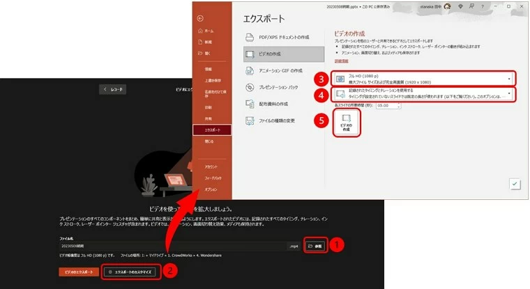 ⑤「ビデオの作成」をクリックすると動画ファイルが作成されます。