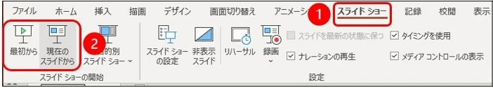 ①「スライドショー」タブを選択します。