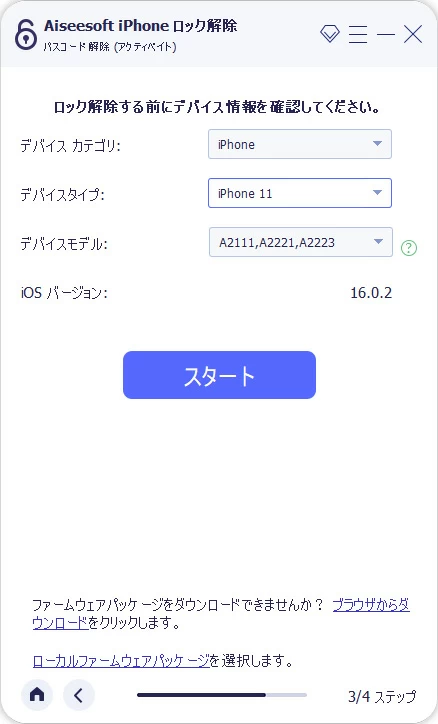 2. iPhoneをパソコンに接続。デバイス情報を確認してから「スタート」をクリックして次のステップに進みます。