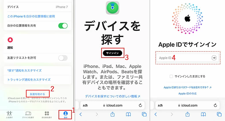 今サインインしているアカウントからログアウトしたくない場合、またはパスワードがわからずアカウントを変更できない場合は、「探す」アプリの「友達を助ける」オプションで、iCloud経由でタッチ画面が壊れたiPhoneを遠隔消去することができます。