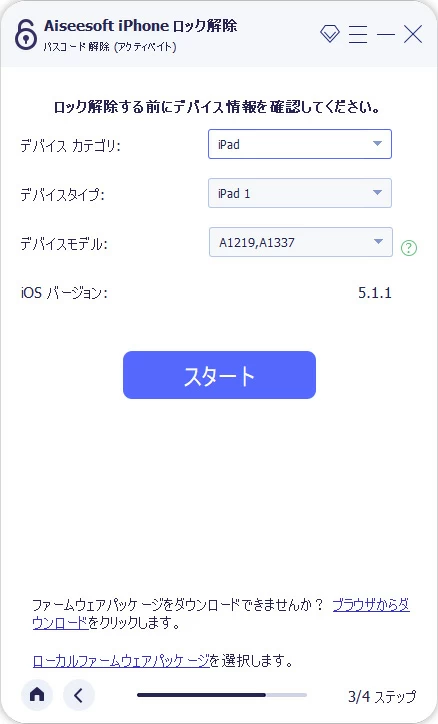 iPadパスコード解除のGoogle検索では、iPhone Unlocker が注目を浴びています。これならパスコード解除機能の操作が簡単です。手順は、iPadをパソコンに接続し、iTunes不要でiPadのパスコード解除に使用されるファームウェアパッケージをダウンロードします。さらに、このロック解除の作業によって、ロックのかかったiPadがリセットされパスワードも削除されます。バックアップを取っていなかった場合、全てのコンテンツと設定が失われ復元することはできません。