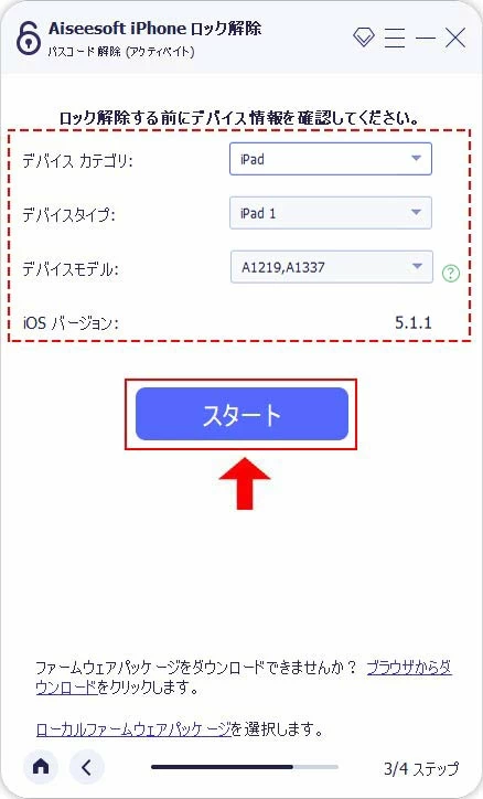 認識されたら、情報を確認し、「スタート」をクリックして続行します。これにより、iPadのロックを解除するための適切なiPadOSファームウェアがダウンロードされます。