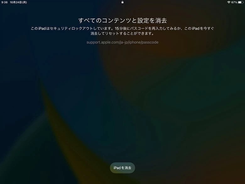 iPadOS 15.2以降を搭載したiPadでは、一定の数の誤ったパスコードを入力すると、「iPadを消去」が表示されます。