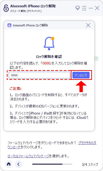 注意事項の内容を読み終わったら、iPhoneのロックを解除するために「0000」と入力し、「アンロック」のボタンを押してください。